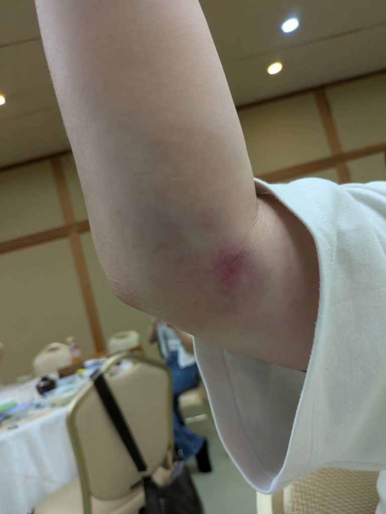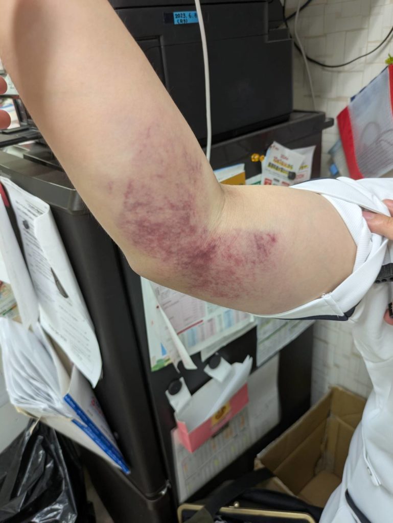 さて、肉離れと診断され、腕はパンパンに腫れて熱を持ち、内出血もひどい状態。